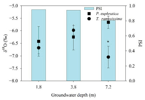 The δ18O value of plant xylem water and the proportional similarity index (PSI) of the proportional water uptake between Populus euphratica and Tamarix ramosissima grown at different groundwater depths. * indicate a significant difference (P < 0.05) between the δ18O values of xylem water in P. euphratica and T. ramosissima grown at the same groundwater depth.