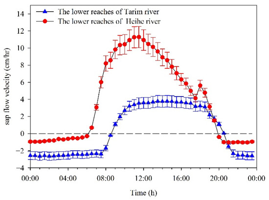 Diurnal variation of lateral root flow rate of Populus euphratica in the lower reaches of Tarim River and Heihe River.