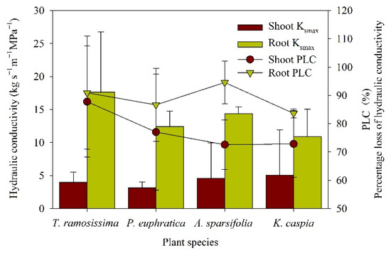 Shoot and root hydraulic conductivity and its percentage loss (PLC) of desert riparian plants.