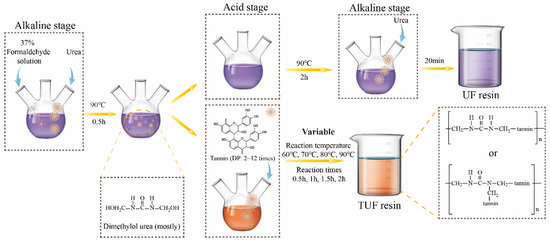 The first step of synthesizing TUF resin is the same as for UF resin. After the first alkaline stage, the temperature was rapidly reduced to 70 °C and the prepared tannin powder was added slowly into the solution without adjusting the pH. The condensation reaction was continued to definite times. Finally, the resulting resin was cooled to room temperature, and the final pH of the resulting resin was adjusted to 8–9 to be ready for use. The process of the synthesis of UF and TUF resins is demonstrated in Figure 1.