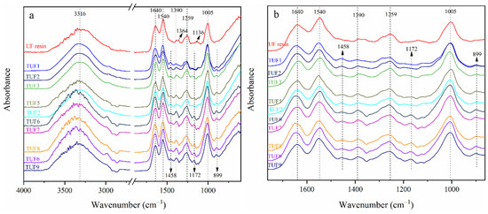 Figure 2 shows the collected FT-IR spectra to identify the differences between UF and TUF resins, whereas assignments of the relevant peaks are also listed in Table 5. As seen in Figure 2, the broad peak existing in all spectra curves at about 3316 cm−1 was related to the -OH stretching vibration. The UF resin shows typical absorption peaks that 1640 cm−1 was associated with the C=O stretching of primary amide, 1543 cm−1 was related to the C=N stretching of secondary amines, and 1255 cm−1 was related to the =C-N or =CH=N stretching of tertiary cyclic amides. Besides, absorption peaks at 1385 cm−1 can be attributed to C-H mode in CH2 and CH3 1364 cm−1 was related to C-N stretching of CH2-N; 1136 cm−1 was related to C-O-C stretching of aliphatic ether; and 1004 cm−1 was related to C-O stretching of methylol groups [2,43]. In case of TUF resins, characteristic absorption peaks of amide I, amide II, and amide III have shifted from 1644, 1543, and 1255 cm−1 to 1652, 1540, and 1261 cm−1, respectively, due to the insertion of tannin that changed the chemical environment of the resin. Theoretically, due to the urea reduction, the absorption peaks at 1640 and 1364 cm−1 decreased while the absorption peak at 1640 cm−1 increased. This may be caused by the superposition of the C=O stretching vibration of the aromatic ring [44]. Moreover, more absorption peaks can be observed that 1458 cm−1 was related to C=C stretching in the aromatic ring; 1172 cm−1 was related to C=C stretching in the aromatic ring; 899 cm−1 was related to C-O stretching, and C-C out of plane bending vibration of the aromatic ring [45,46].