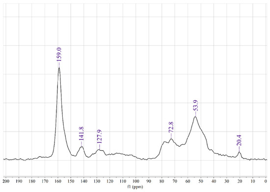 According to the previous study, the 13C NMR spectra of UF resin had four regions about carbon peaks [47,48,49]: 155~170 ppm attributed to the carbonyl carbon of urea and its derivatives; 69~95 ppm attributed to the methylene ether bond; 65~72 ppm attributed to hydroxymethyl; 45~60 ppm attributed to methylene. To confirm the variation of TUF resin, Figure 3 shows the solid-state 13C NMR of cured TUF resin and the relevant peak assignment was listed in Table 6 to compare the difference between UF resin and TUF resin. It can be observed from 13C NMR data that the peaks at 158.9, 72.8, and 53.9 ppm refer to carbons of the amide, hydroxymethyl, and methylene, respectively. This structure indicated that there are still many amide bonds in the cured structure of TUF resin, and the connection mode is still mainly methylene bridges. In addition, the peak at 141 ppm represents the double bond connection between the carbon on the benzene ring and the surrounding oxygen, and the peak at 127 ppm reveals the connection between the carbon on the benzene ring and the methylene carbon resulting from substitution on the benzene ring [44,50]. It is clear that the amide groups will reduced (easily hydrolyzed by water) in the system when tannin participates in the copolymerization with methylol urea, which is also the reason for improvement of water resistance of the TUF resins. Moreover, due to the characteristics of tannin that quickly reacts with formaldehyde, it reduces the free formaldehyde in the resin system.