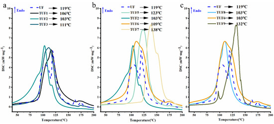 DSC of UF and TUF resins prepared under varied reaction conditions. (a) reaction temperature; (b) reaction time; (c) tannin addition.