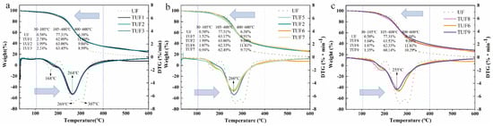 The thermal stability of resins was evaluated by TGA to assess their susceptibility to degradation, and the results are given in Figure 5a–c. As seen the TG and DTG curves in Figure 5, the thermal degradation commonly occurs in three stages at 30~105 °C, 105~400 °C, and 400~600 °C. The weight loss in the first step of degradation occurs by eliminating any absorbed water. The second step is the main stage of weight loss that the resins encounter. From the DTG curves, there are several steps in case of UF resin: the peak at 168 °C refers to the decomposition of terminal methylols of the resin into formaldehyde and water. The peak at 264 °C was attributed to the cleavage of the methylene ether bond with the release of formaldehyde, and the peak at 306 °C was attributed to the decomposition of methylol urea [51,52]. Additionally, during the stage of 105~400 °C, the weight loss of UF resin is up to 77.31%. Compared to UF resin, it is also observed a weightless peak at around 168 °C for TUF resins in DTG curves, but the weight loss rate is lower than UF resin. It can be explained that the introduction of the tannin structure caused a decrease in free methylols. Additionally, the weight loss of modified TUF resins reached the maximum rate in the temperature at an interval of 250~270 °C and their weight loss was only around 60% to 64%, lower than UF resin, indicating modified TUF resins acquired outstanding thermal stability with respect to UF resins in the second thermal stage. In addition, the weight residual of UF resin at 600 °C reached 15.7%, and all the TUF resins were in the range of 23%~29%. These results led us to the conclusion that TUF resins had better thermal stability than UF resin.