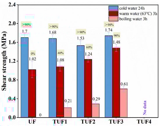 Tannin addition can increase the environmentally friendly nature of the modified resins. Most importantly, it can strengthen the bonding performance of TUF resins under either warm water or boiling water condition as compared to UF resin. Figure 8 demonstrates the shear strength of plywood bonded using TUF after cold-water soaking is still lower than that of UF resin, which is similar to the samples obtained with resins prepared via different reaction temperatures and times. However, the bonding performance of TUF-derived plywood under warm or even boiling water soaking conditions was superior to that of UF resin remarkably. This can be attributed to the substitution of second batch of urea using tannin, thus increased the molar ratio of F/U, which has benefits on the formation of dimethylourea, which is the main component to crosslink between resin layer and wood. This causes the performance of TUF resins to improve significantly considering the parallel strengthening effect on this network structure by the tannin. However, an increase in the molar ratio of F/U has a negative effect that often generally leads to an increase in the amount of formaldehyde emission [55]. However, as this was not the case, this indicates that the tannin was incorporated effectively into the network structure by consuming a large amount of hydrophilic methylol urea, therefore the cured TUF-based formulations acquired better resistance to warm or boiling water than UF resin. Furthermore, the structure of tannin itself increases the rigidity of the resin system and improves the bonding quality [36,44]. Last, it is thought that the decomposition provoked in hot/boiling water to the plywood bonding can be dynamically reversed via a compensation reaction that involves alternative bonds formation.
