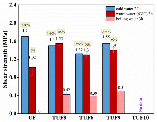 In case of the warm-water treatment, it can be inferred that the shear strength of plywood specimens showed an increasing trend with the extension of reaction time. When the reaction time was 2 h, the shear strength of TUF resin reached 1.39 MPa, 36% higher than UF. Additionally, most of the TUF resins-based plywood exhibited reasonable shear strength after being soaked in boiling water for 3 h, except TUF5, which signifies that the reason belong to that the copolymerization was not profound.