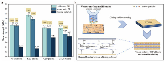 (a) Shear strength of plywood specimens prepared with veneer exposed to varied regimes of plasma treatments using different equipment; (b) Plasma illustration (the highlight indicates the wood failure rate.