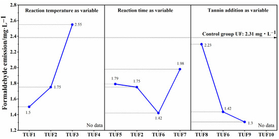 The formaldehyde emission of plywood is one of the criteria for judging its quality. Reducing the formaldehyde emission is also an essential concern in the field of wood-based panels [61,62]. Due to the reactivity with formaldehyde, tannin is often used as a formaldehyde scavenger for resins [45,62]. In this study, without the second batch of urea, the resin will have a high mole ratio of F/U, which is most likely to trigger a high free formaldehyde level in the resin system [55]. However, Figure 10 illustrates that the formaldehyde emission from TUF resins was lowered in most plywood samples with respect to UF, which can be directly related to the presence of tannin. It is obvious from the figure that the formaldehyde emission from the plywood specimens increases as the reaction temperature during the resin synthesis increases. However, extending the reaction time of the resin, the formaldehyde emission of the plywood specimens shows a tendency to decrease first and then increase. When the reaction proceeded for 1.5 h, the formaldehyde emission reached a level, as much as 1.42 mg/L, which is 39% lower with respect to UF resin. Furthermore, the increased tannin content also helps to reduce the amount of formaldehyde emission from plywood. When increasing the amount of added tannin to 25 g, the value of formaldehyde emission reached 1.3 mg/L, which is 44% less than that of UF resin. In general, the formaldehyde emission of plywood will not only be affected by the temperature and time of resin synthesis, but also by the amount of added tannin. The higher the added tannin, the lower the formaldehyde emission. However, it should be clear that too much tannin addition can cause gelation.