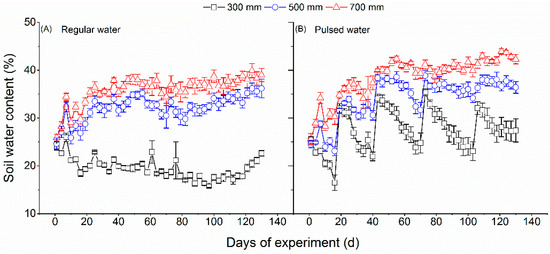 After one month of recovery growth, we started the water treatment on 16 March 2020, and continued it for 240 days until November 10 (end-season), 2020. The water treatments included three water amount levels (300, 500, and 700 mm) and two watering regimes (regular and pulsed). The growing season precipitation amount of 700 mm was selected because it corresponds to that amount occurring in Zhejiang province. Six pots (n = 6) were treated by each of the six water treatments (6 replicates × 3 amount levels × 2 watering regime levels = 36 pots). The water was added during the experiment period according to the following procedure. The water amount of 300, 500, or 700 mm regular watering treatment was added in 80 equal amounts (3.75, 6.25, and 8.75 mm, respectively) every three days across the experiment period (80 × 3 = 240 treatment days). For the pulsed watering treatment, two heavy rainfall events (2 times × 38 mm each = 76 mm) and two intense rainfall events (2 times × 52 mm each = 104 mm) were arranged during the rainy season (see Figure 1B). The remaining water amount of 120 (300 – 76 – 104 = 120), 320 (500 − 76 − 104 = 320), and 520 mm (700 − 76 − 104 = 520) was then added in 76 (80 times − 4 special rainfall events) equal amounts (0.68, 4.21, and 6.84 mm, respectively). The soil water content (%) was measured before each watering from day 1 to day 240 of the experiment when pulsed watering occurred, using a soil water probe (Procheck, Decagon Devices, Inc., Pullman, WA, USA), however, only the data from day 1 to day 140 were shown due to the loss of the subsequent data (Figure 1).