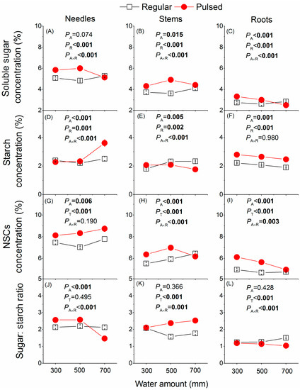 Both water amount and the watering regime had significant effects on the concentrations of soluble sugars, starch, and NSCs in needles, stems, and roots, and their effects exhibited significant two-way interactions (Figure 4), except for needle NSCs (Figure 4G) and root starch (Figure 4F). The concentrations of NSCs were significantly higher in plants under pulsed watering supply than under regular watering supply across the three plant tissues (Figure 4) except for stem starch (Figure 4E). The ratio of soluble sugars to starch was also significantly affected by the interaction between water amount and watering regime (Figure 4J–L), but the water amount affected the ratio in needles (Figure 4J) and the watering regime influenced that ratio in stem and roots (Figure 4K,L).