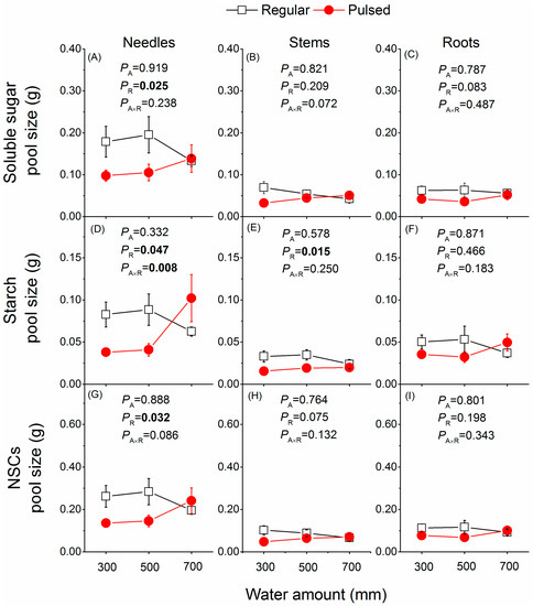 Irrespective of water amount, overall the pool size of NSCs seemed to be somewhat greater in plants under regular than under pulsed watering regime (Figure 5), although significant effects of the watering regime were found only for needle NSCs pools (Figure 5A,D,G) and stem starch pools (Figure 5E).