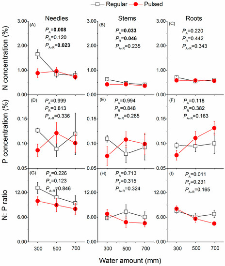 Effects of the watering regime (regular vs. pulsed) and water amount (300, 500, and 700 mm) on concentrations of N (A–C), P (D–F), and N to P ratio (G–I) in different tissues of P. massoniana saplings. p values of two-way ANOVAS are given. A and R represent water amount and watering regime, respectively. Plotted are means ± SE.