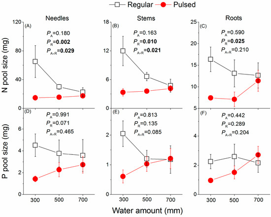 Effects of the watering regime (regular vs. pulsed) and water amount (300, 500, and 700 mm) on pool size of N (A–C) and P (D–F) in different tissues of P. massoniana saplings. p values of two-way ANOVAS are given. A and R represent water amount and watering regime, respectively. Plotted are means ± SE.