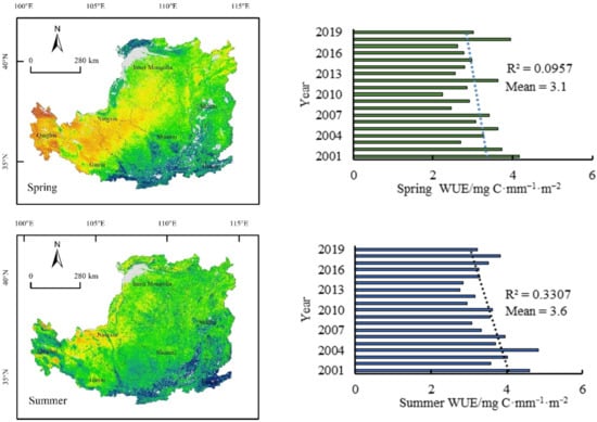 Spatial (left) and temporal (right) distribution of seasonal vegetation water-use efficiency (WUE) on the Loess Plateau.