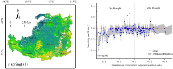 Generally, negative γspring values (81%), meaning spring drought led to increased WUE, were observed in the spring in the study region, with a mean (γspring) of −0.06 (Figure 5(a1)). The significant test area (8.2%) was mainly dominated by shrublands and grasslands (Figure S1(a)). The relationship between interannual sensitivity of WUE to SPEI and drought index in spring (Figure 5(b1)) showed a consistently increasing γspring, along with an increasing magnitude of drought in the Loess Plateau. When the drought continued to increase, the magnitude of the increase, γspring, was smaller, which means that the higher magnitude of drought, the lower the sensitivity of WUE to drought (Figure 5(b1)).