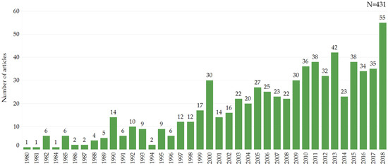 Asian peoples have long reflected and implemented inventive wisdom and strategies in diverse agroforestry systems for their basic fuel, food, medicine, and cash income needs [4]. However, since the early 20th century, growing populations and food requirements have led to agroforestry land in Asia being converted into intensive agriculture and monoculture tree plantations, causing environmental and social challenges, such as a loss of food and homes for forest-dependent species and peoples [5]. Scientists have begun to acknowledge high levels of complexity and environmental heterogeneity in the interactions of trees, crops, and animals [6] and the various ecosystem services they provide. Sustainable agroforestry landscapes came into the spotlight in the late 20th century with growing global concern over environmental issues, natural resource depletion, and climate change [4]. Since agroforestry began to gain more attention in Asia, agroforestry research has been increasing steadily in the region (Figure 1) [7].