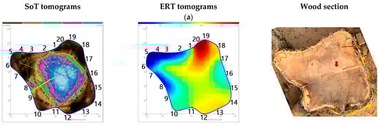 Comparison of the SoT/ERT tomograms and the tree cross-section (the dotted red lines indicate the decayed area. In the SoT tomograms—brown: healthy wood, red and blue: defects, green: initial decays; in the ERT tomograms—blue: high water content, red: lower water content, green and yellow: decreasing water content. (a–j): wood section ID).