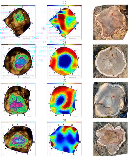 - Wu, X.; Li, G.H.; Jiao, Z.; Wang, X. Reliability of acoustic tomography and ground-penetrating radar for tree decay detection. Appl. Plant Sci. 2018, 6, e01187. [Google Scholar] [CrossRef] [Green Version]