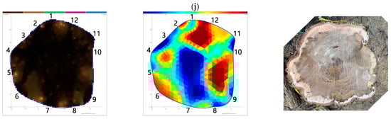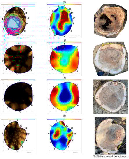SoT tomograms in Figure 1g–j revealed that the sonic velocity was constant and that wood density was mostly normal. Some sapwood or heartwood areas had low electrical resistance and relatively high moisture content, with the possibility of incipient decay undetected in SoT tomograms. Some incipient decay was identified in the actual wood section, which was a minor defect that did not yet affect the wood density. In Figure 1g, white rot was identified in the sapwood of MP2~8, as shown in the ERT tomogram. In Figure 1h, most of the wood, except for MP1, was healthy. In Figure 1i, white rot was observed between the heartwood and sapwood of MP9~11; however, the overall wood density was sound. In Figure 1j, the sonic velocity was normal, but the possibility of incipient decay was detected because of the high moisture content in the ERT tomogram. Discoloration of the site was observed in the actual cross-section, with expected advancement of incipient decay (Argus Electronic Gmbh 2017). The analysis of the area of defect for Figure 1g–j revealed that the defects of the SoT tomogram were 0~(−)12.3%, with an average error of (−)4.6%. The actual defect was somewhat underestimated because incipient decay was not detected in the SoT tomogram.