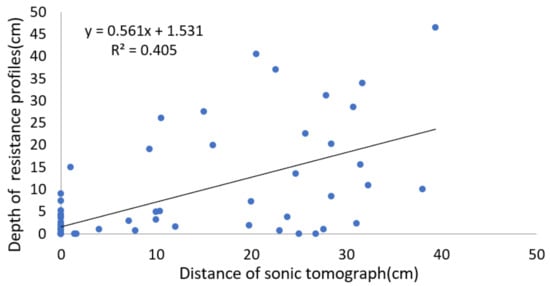 The results of RM and SoT measurements are presented in Table 4. To analyze the error rate of the measurement results of SoT, RM was performed on the same 85 MPs (Table A1, Appendix A), and an independent t-test and regression analysis were performed. The t-test analysis of the tomograms and RM profiles at 85 measuring points showed an average defect length of 8.1 cm and 6.1 cm for SoT tomograms and RM profiles, respectively. The average error rate was 2.0 cm, and there was no significant difference between the two groups (Table 4). The linear regression analysis revealed that the regression model was significantly positively correlated with the change in the RM results of the regression equation. However, the correlation with the RM results, with an explanatory power of 40.5%, was lower than those observed in fir (R2 = 0.675) and zelkova trees (R2 = 0.764) [8,9] (F = 56.442, p < 0.001, R2 = 0.405, Figure 2).