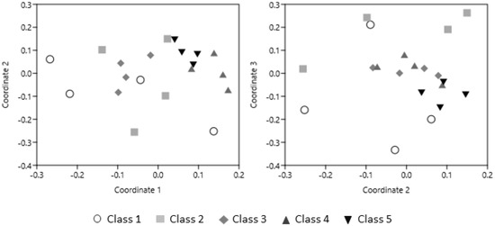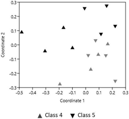 The outcomes of the ANOSIM global test (Table 2) showed a significant effect of the decay class on ciliate community composition (p < 0.001), although the R value was close to 0.5; therefore, it was interpreted as separated but overlapping [37]. The pairwise comparison showed that the assemblages of ciliate communities of the early decay classes 1 and 2 significantly differed from those of the late and intermediate decay classes 3, 4, and 5 (Table 3).
