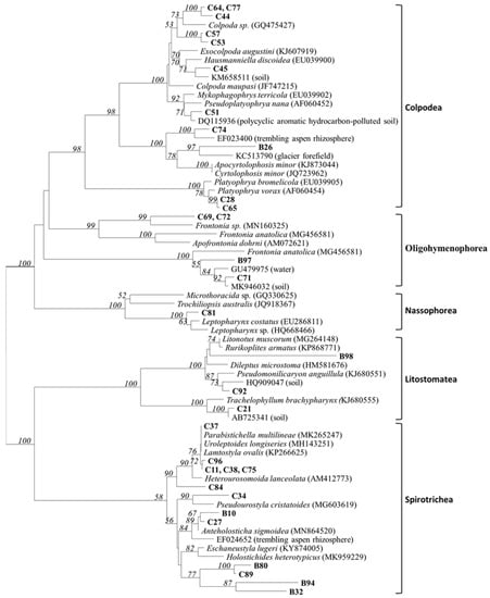 The phylogenetic tree reported in Figure 3 was obtained by align our ciliate sequences with other retrieved from GenBank. Overall, our sequences clustered within five ciliate classes. The predominance of the sequenced clones was related to sequences representative of the most common ciliate taxa found in soil, such as Colpodea and Spirotrichea. The remaining sequences were related to ciliate classes that have been described as being less present in soil, such as Oligohymenophorea, Nassophorea, and Litostomatea.
