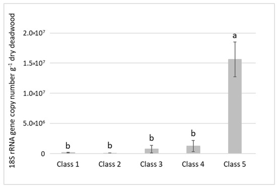 The abundance of ciliate community determined by means of qPCR assay showed an exponential increase (R2 = 0.96) in line with the advance of decay classes, which was significant for the decay class 5 (p < 0.05). The abundances were 1.23 × 105, 5.94 × 104, 7.28 × 105, 1.23 × 106, and 1.56 × 107 18S rRNA gene copy number g−1 deadwood dry weight for the decay classes 1–5, respectively (Figure 4).