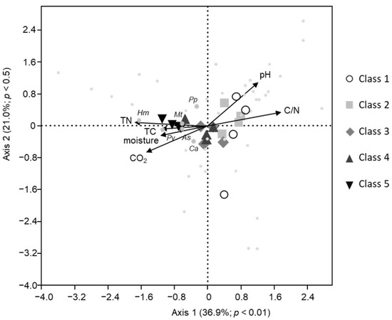 Canonical correspondence analysis (CCA) ordination diagram of ciliate community and environmental variables defined by the first and second axes. DGGE band scores were also plotted as light grey dots; bands that significantly contribute to separate last decay classes were plotted as stars: Holosticha multistylata (Hm); Platyophrya vorax (Pv); Mykophagophrys terricola (Mt); Anteholosticha sigmoidea (As); Colpoda aspera (Ca); Paraholosticha pannonica (Pp). Vectors represent deadwood moisture, pH, deadwood total C content (TC), deadwood total N content (TN), deadwood C/N ratio, and CO2 flux from deadwood cores. The percentage of the variation in the data and significance is reported at each axis.