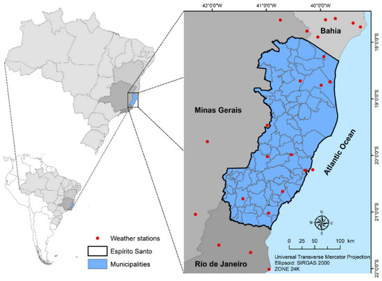 The study was carried out for the State of Espírito Santo, which has a territorial area of 46,053.19 km2. It is located between the parallels of 17°53′2″ to 21°18′03″ south latitude and the meridians 39°41′18″ to 41°52′45″ west longitude (Figure 1).