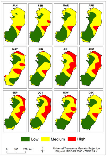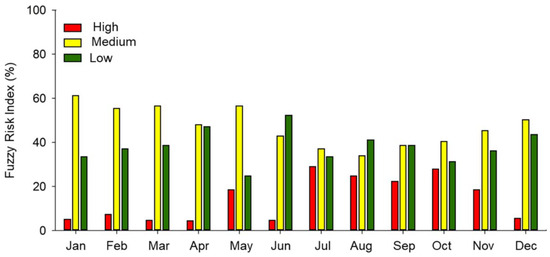 Throughout the year, it is observed that there was a predominance of areas classified as low and medium fuzzy risk index, which may vary, for the low-risk class, from 25% to 50% in the months of October and June, respectively, and from 25 to 60% for the months of August and January, respectively, in the medium-risk class (Figure 4).