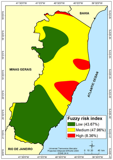 Eucalyptus rust zoning for Espírito Santo was performed based on the fuzzy methodology for each calendar month and for the annual average. The risk index calculated from the fuzzy methodology is hereafter referred to as the “fuzzy risk index”. The fuzzy methodology was selected for the present study because it has already been applied broadly across the agricultural sciences [4,29,30,31,32].