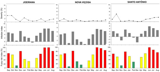 Severity of eucalyptus rust (%), infection index according to the equation of [11], and fuzzy risk index for the period from October 2008 to August 2009, under field conditions, in the municipalities of Joeirana, Nova Viçosa, and Santo Antônio, located in the extreme south of Bahia, Brazil.