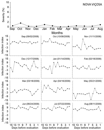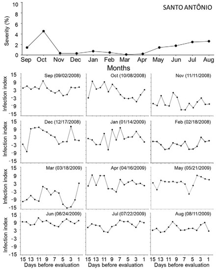 In Nova Viçosa and Santo Antônio, the opposite situation was documented for the month of December, in which low disease intensity was observed (0.33% and 0.28%, respectively), but the infection index values were high in the 15-day period prior to our monthly field evaluations, reaching up to 10.9. However, for both areas, in the same month, negative indexes were also observed (−5 and −6), suggesting that the model for estimating the infection index lacks sufficient precision for studying disease intensity under natural conditions of infection (Figure 9 and Figure 10).