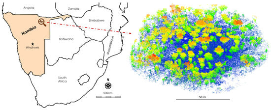 The research site is located near Rundu (Namibia; 18°12′33″ S 19°38′05″ E, 1180 m a.s.l.), inside the Kavango region, and is part of the Hamoye Forest Reserve, owned by the national government of Namibia (Figure 1). The regional mean annual air temperature is 22.6 °C (range 1.8–43.9 °C), while the mean annual precipitation sum is 527 mm (range 348–816 mm), markedly summer rainfall [,]. Soils are generally classified as Arenosols, primarily dominated by a deep soil layer with rapid permeability, low water-holding capacity, and low nutrient content [,,].