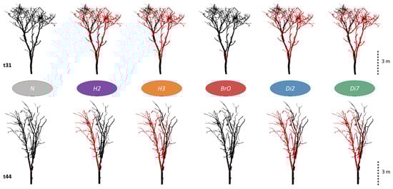 Tree structures (QSMs) for trees t31 and t44 with queried branches in red (wood to be removed).
