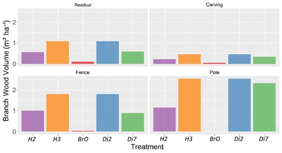 Harvesting simulations H3 and Di2 delivered 2.54 m3 ha−1 of pole wood quality, while Di7 and H2 yielded 2.33 m3 ha−1 and 1.15 m3 ha−1, respectively (Figure 4). The production of any of the assortments was maximised in H3 and Di2, while BrO delivered less than 1 m3 ha−1 of wood. Treatments H3 and Di2 produced 1.8 m3 ha−1 of fencing wood, 0.46 m3 ha−1 of carving wood, and ~1.1 m3 ha−1 of residual wood. Branch wood yields in linear metres are available in Table S3.