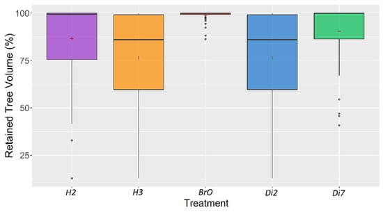 Boxplots of the relative retained tree volume for the harvesting simulations with crosses representing the treatment’s mean.