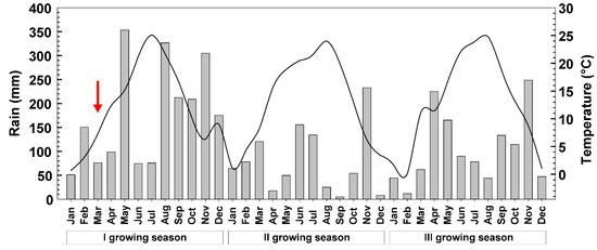 Air temperatures and precipitation at the experimental area during the research (first, second and third growing seasons after transplanting plants from the nursery to the field). The red arrow indicates the month of transplanting in the field.