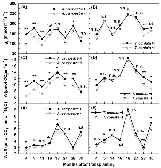 Effect of mycorrhizal inoculation in the nursery on stomatal conductance (gs, mmol m−2 s−1), carbon dioxide assimilation (A, μmol CO2 m−2 s−1) and water use efficiency (WUE, μmol CO2 mmol−1 H2O) of Acer campestre L. (A,C,E) and Tilia cordata Mill. (B,D,F) transplanted in the field. Within each panel and sampling date, * and ** indicate significant differences between +I (inoculated) and −I (non-inoculated) plants at p ≤ 0.05 and p ≤ 0.01, respectively; n.s. indicates no significant differences.