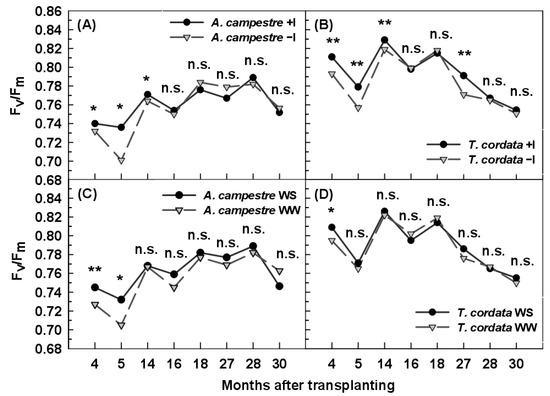 Effect of mycorrhizal inoculation and water regime in the nursery on maximal quantum yield of PSII (Fv/Fm) of Acer campestre L. (A,C, respectively) and Tilia cordata Mill. (B,D, respectively) transplanted in the field. Within each panel and sampling date, * and ** indicate significant differences between +I (inoculated) and −I (non-inoculated) plants and between WW (well-watered) and WS (water-stressed) plants at p ≤ 0.05 and p ≤ 0.01, respectively; n.s. indicates no significant differences.