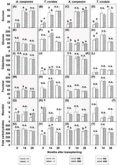 Effect of mycorrhizal inoculation and water regime in the nursery on leaf soluble carbohydrate content (expressed as µmol g−1 of dry weight) of Acer campestre L. and Tilia cordata Mill. measured 5, 14 and 28 months after transplanting. +I, inoculated plants; −I, non-inoculated plants; WW, well-watered plants; WS, water-stressed plants. Plots in gray represent carbohydrate values of Acer campestre, whereas plots in white represent values of Tilia cordata. (A–V,X,Y) Within each panel and sampling date, different letters indicate significant differences between +I and −I plants and between WW and WS plants at p ≤ 0.05 and p ≤ 0.01, respectively; n.s. indicates no significant differences.