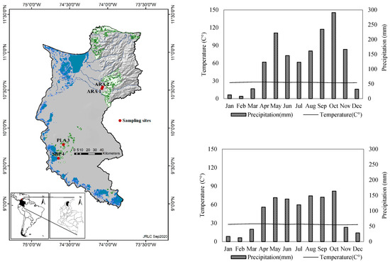 Figure 1. Study area and climatographs indicating air temperature and precipitation. Mountain landscape: ARA 1 and ARA 2; Lomerio landscape: PLA 4 and SBP 5. Annual precipitation and temperature were 1551 mm and 27.4 °C for the Mountain landscape, respectively, and 1112 mm and 28.1 °C for the Lomerio landscape, during the long-term record (1958–2019).