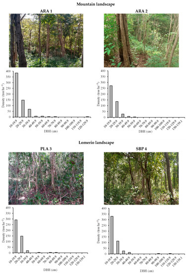 A total of 21 circular plots of 500 m2 were randomly established in TDFs. Nine plots were distributed in the Mountain landscape (4 plots in ARA 1, and 5 plots in ARA 2), and 12 in the Lomerio landscape (6 plots in PLA 3, and 6 plots in SBP 4). Within each plot, all tree individuals ≥10 cm DBH (diameter at breast height: 1.3 m) were identified and measured. Species that could not be identified in the field had leaf, flower, or fruit samples collected, photographed, and subsequently identified in the herbarium of the University of Magdalena. The height (H) of each individual was recorded and some characteristics of the terrain and intervention activities were described.
