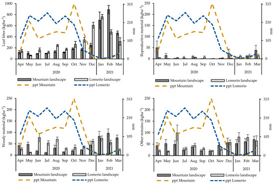 Figure 3. Monthly production of litter fractions (kg ha−1) in landscapes of Magdalena, Colombia. ppt: precipitation. Mean ± SE (n = 9 plots for Mountain landscape, and n = 12 plots for Lomerio landscape).