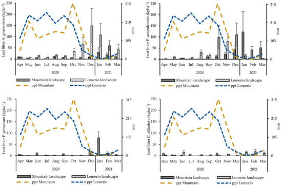 Figure 4. Monthly production of Leaf litter (kg ha−1) of the dominant species in landscapes of Magdalena, Colombia. ppt: precipitation. Mean ± SE (n = 9 plots for Mountain landscapes, and n = 12 plots for Lomerio landscapes).