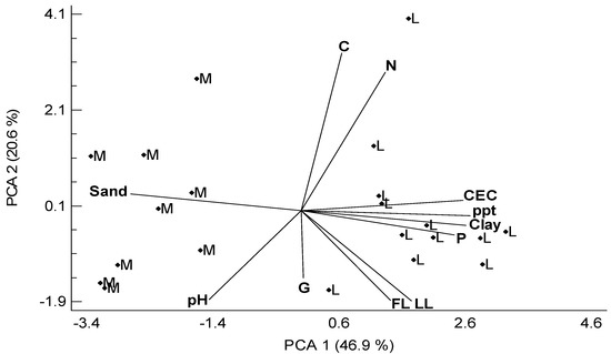 The first four components (PCA) explained 91.4% of the total variation (Figure 5). The 46.9% of the variability was explained by the first axis (PCA 1) and 20.6% by the second (PCA 2). In general, differences between the landscapes were observed along the ordination axes. For the first component (PCA 1), positive associations were observed for ppt (r = 0.44), Clay (r = 0.42), CEC (r = 0.41) and negative for Sand (r = −0.44). The second component (PCA 2) was positively associated with C (r = 0.57), N (r = 0.49), and negatively with pH (r = −0.32).