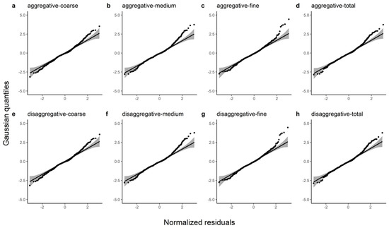 In addition, due to the simplified variance functions of Affleck et al. (2016) that we used [32], the raw residuals were no longer suitable for the residual diagnostics. The normalized residuals were a better diagnostic method, Equation (17):