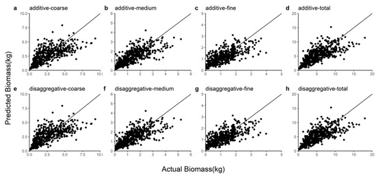 Comparison of coarse root, medium root, fine root, and total root biomass predictions for the additive and disaggregated models. (a–d) represent the predicted coarse, medium, fine and total roots from the additive model; (e–h) represent the coarse root, medium root, fine root and total root predicted by the disaggregated model.