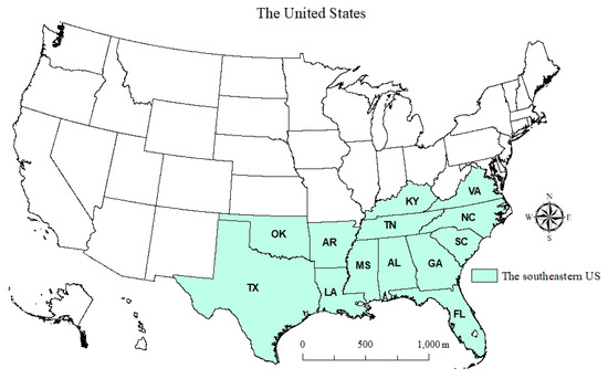 The study area included the 13 states in the southeastern United States: Alabama, Arkansas, Florida, Georgia, Kentucky, Louisiana, Mississippi, North Carolina, Oklahoma, South Carolina, Tennessee, Texas, and Virginia (Figure 1). A large portion of this region (31%) is covered by southern pine stands, which include loblolly (Pinus taeda), shortleaf (Pinus echinata), longleaf (Pinus palustris), and slash pine (Pinus elliottii), among which loblolly pine is the most commercially managed pine species [34]. Of the total forest area in this region, 20% are of plantations origin, which are mostly (86%) dominated by southern pine monocultures (i.e., loblolly-shortleaf pine—71%, and longleaf slash pine—15%). About 40% of total plantations are owned by non-industrial private forest (NIPF) landowners. The southeastern timberlands have made a significant contribution to the nation’s economy. For example, this region alone supplies more than half (60%) of all timber in the United States [3]. The forestry-related business in the southeastern region is responsible for over 1.3 million jobs (45% of the nation total contribution) and approximately 55 billion in total payroll [22].