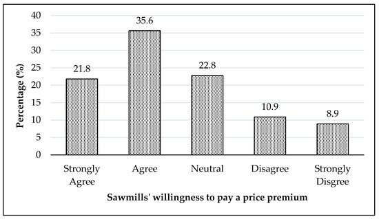 Procurement distance (DISTANCE) is another important factor that reflects sawmill behavior while purchasing raw materials (Sorenson et al. 2015). This categorical variable was measured on a five-point scale: 1 = 0–40 km, 2 = 41–80 km, 3 = 81–120 km, 4 = 121–160 km, and 5 = >160 km. It was expected that sawmills preferred purchasing raw materials within the shortest hauling distance to their mill to reduce transportation costs and time [31]. Therefore, high-quality timber-seeking sawmills were expected to be able to offer a price premium if quality wood was available within relative proximity from their locations. The variable YEAR indicated the number of years a sawmill had been in business. We assumed that sawmills were likely to increase their production capacity by upgrading technology over time. However, it is possible that sawmills might not be upgraded despite operating for many years. Thus, the variable YEAR was expected to have a positive relationship with WTP a price premium. The variable YEAR was transformed into a binary (dummy) variable based on the median score, where values below the median score were assigned ‘1’ (i.e., if sawmills were in business for less than 40 years), and ‘0’ otherwise.